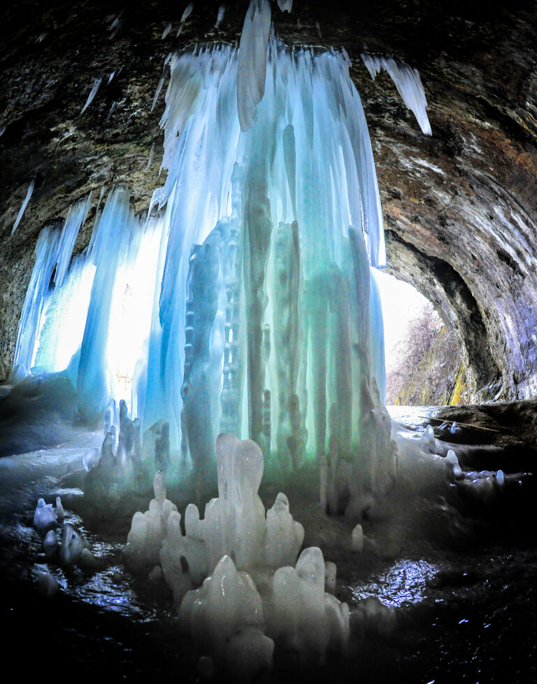 위아래로 자란 고드름이 맞물린 터널 내부는 마치 거대한 이빨을 드러낸 동굴처럼 보인다. 12월 중순부터 이듬해 2월까지 짧은 기간에만 만날 수 있는 이 풍경은, 거꾸로 흐르며 앞으로 나아가려는 역동성을 상징하는 장면처럼 다가온다.